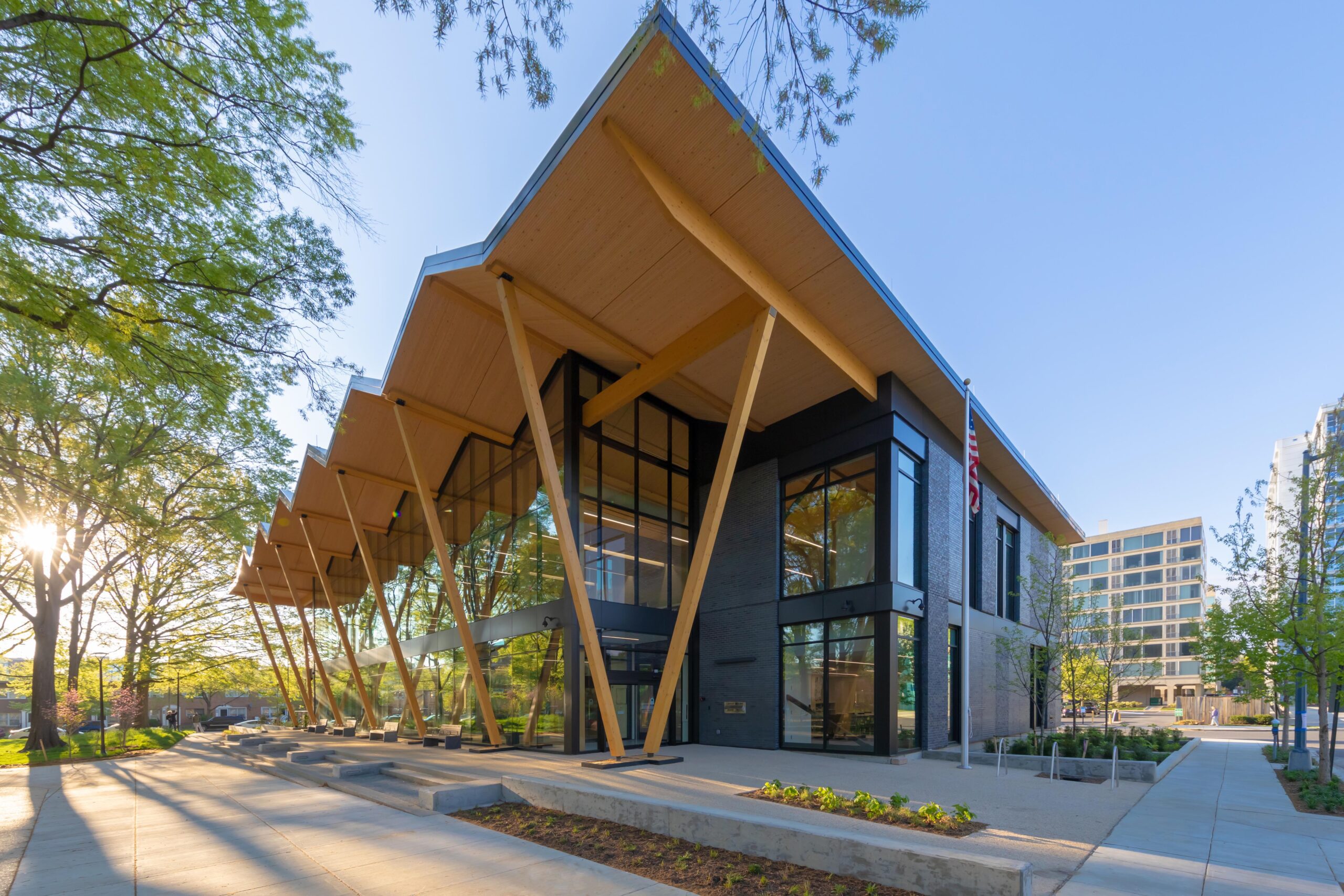 In Washington, D.C., Turner Construction Company constructed the gorgeous, light-filled Southwest Library using a mass timber-steel hybrid, incorporating steel elements as part of the lateral force-resisting system.