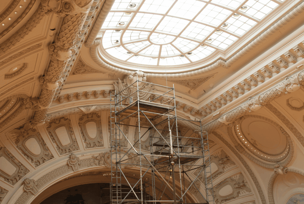 To protect the hall’s irreplaceable stone statues and ornate architectural finishes, the team constructed custom, plywood barriers to shield those features from debris, tools and human contact throughout the renovation project.