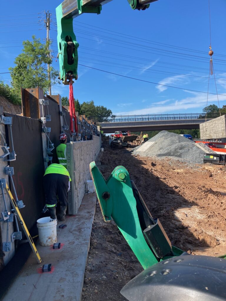 Wagman and its inhouse engineering team devised a VE option “where we installed pairs of pipe pile in small, 10-foot segments under the power line,” O’Neill said. “We also changed the design of the rest of the wall from large, galvanized, expensive piles to standard H piles with a mechanical connection to a precast facing, instead of a poured facing.”